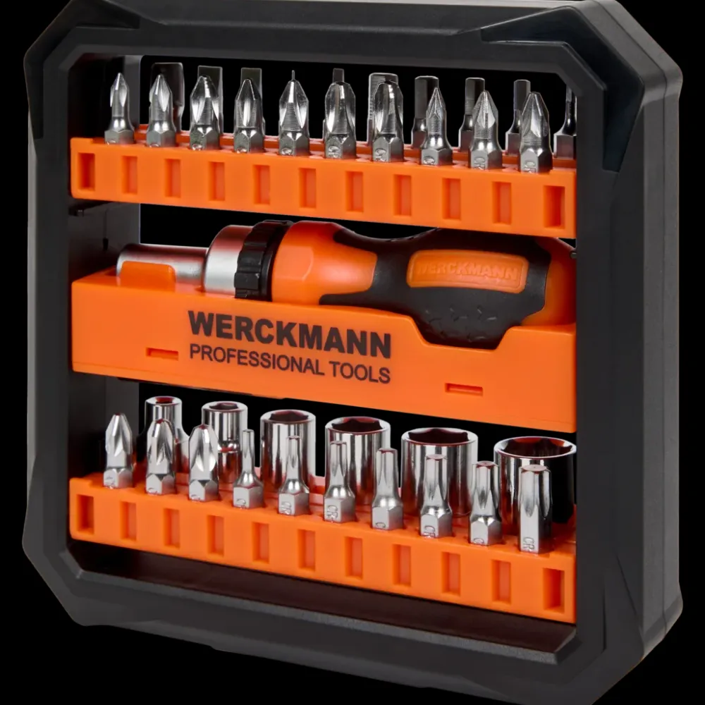 - 1x adapter, 1x verlengstuk, 6x 1/4 Dr doppen en 29x bits van 25mm